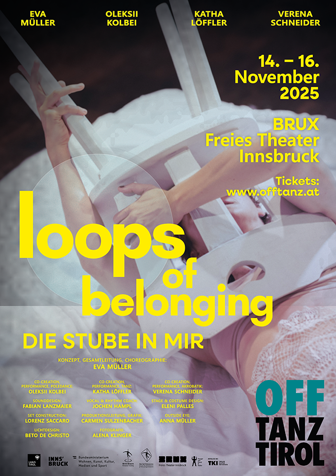 Mit jeder Bewegung schreiben die Performenden neue Geschichten in die Haut des Raumes ein. Ihre Körper wiederholen Gesten und traditionelle Elemente, dehnen sie, verschieben sie, lassen sie scheitern und neu entstehen: Die fluide Stube wird zum Herzstück einer fließenden Identität. OFFTANZ Tirol bringt mit „loops of belonging“ eine flirrende Tanzperformance auf die Bühne des BRUX, die sich weigert, Heimat festzuschreiben – und sie stattdessen in flackernden Bildern immer wieder neu erfindet. Die Idee der traditionellen Stube wird neu interpretiert und kreist um ein vibrierendes Geflecht aus Erinnerungen, Atmosphären und Ritualen. Ein widerständiger, sich variierend wiederholender, fließender Akt, der nicht stillsteht.